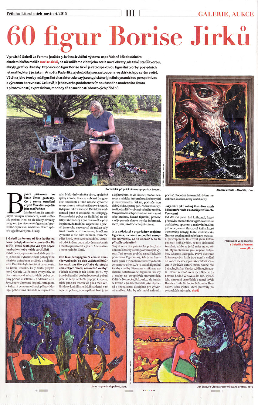 V Literárních novinách, části Galerie, Aukce je publikován krátký rozhovor Borise Jirků v souvislosti s právě běžící výstavou v Galerii La Famme. Celý rozhovor naleznete zde .